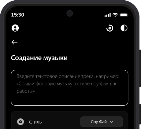 Генерируйте уникальные треки в любом стиле по текстовому описанию. Просто опишите настроение — и получите готовую композицию.